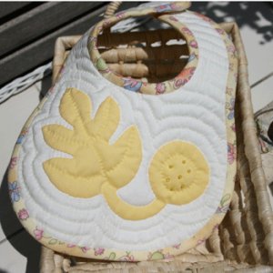 お選びいただける《ベビーイエロー+オフホワイト》のビブには、とっても愛らしいプリントファブリックを使ったバイヤステープがついています。